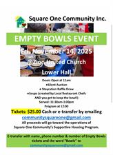 Square One Community is holding our 4th Annual “Empty Bowls” Event on Friday, November 14th, 2025 from 11am-1:30pm at Zion United Church Lower Hall, to help raise funds for Square One Community SUPPORTIVE HOUSING PROGRAM.